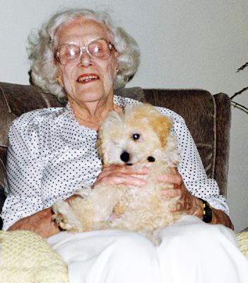 This was when she started to worry about being alone. I suggested we get her a dog since Mother has had them all of her life. She believes when she dies she'll again see all her pup friends. (Mother could be right and God'll have to give her a fair-sized yard in heaven.)