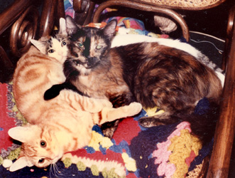 Mica is the tortoise-shell. Rhue is the Orange Tabby. Potter is the Tabby.