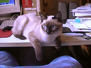 This is my cat, Sezyou. He is wonderful, classic, Siamese. None of this footlong nose, but applehead, big blue eyes and a loving disposition.